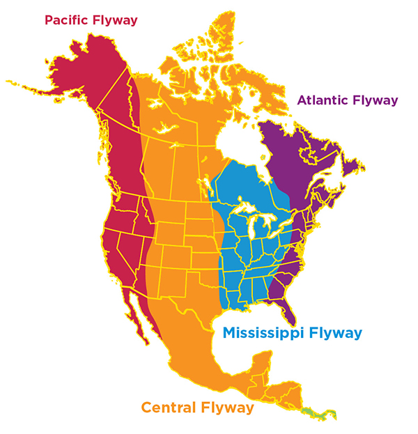 North America’s mountain ranges and coastlines run mostly north-south, and so does its largest river, the Mississippi. These natural features create four main “flyways” that many migrating birds follow. From west to east, the four main routes are the Pacific Flyway, the Central Flyway, the Mississippi Flyway, and the Atlantic Flyway. Which flyway do you live in?