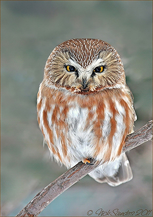Owls are birds of the hunt—predators. They are equipped with exceptional vision and excellent hearing in order to home in on prey. An owl’s eyes are probably it’s most distinctive feature. These organs are proportionately quite large and capable of rapid and sharp focusing at various distances. In fact some large species, such as the Great Horned Owl, have eyes larger than those of humans. Equally important, the eyes are directed forward and, since their fields of view greatly overlap, they provide excellent binocular vision. But because owls’ eyes are fixed in bony sockets, owls must turn their heads to see objects to the side. Extra neck vertebrae provide such great flexibility that an owl can turn its head through an arc of 270 degrees. Humans also have binocular vision, but our heads can only rotate 180 degrees. (But of course human eyes can rotate in their sockets.)
