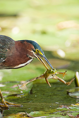 Wading birds do not swim or dive to catch food; rather they wade into shallow water to obtain food not found on land. A close look at the body of a wading bird reveals obvious characteristics that are useful in a watery habitat. A long neck is an adaptation that makes it possible to strike at prey while walking around on extra-long legs. Long legs help keep their feathers high and dry when wading into water in search of food. The benefits of wading birds’ long, thin, spread-out toes are threefold: Thin toes are easier to pick up and put down when walking in water and squishy mud. Spread-out toes keep them from sinking into soft mud in the water and at the water’s edge. And those toes also disperse the weight of these big, tall birds, helping them keep their balance over their long legs.