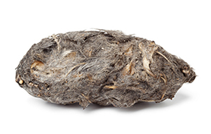 Owls swallow small prey animals like mice in one gulp—fur, bones, and all. The indigestible material is packed into a pellet and regurgitated a few hours after feeding. Pellets are usually gray or brown, oval or oblong, and may be found under regular owl roosts or nesting sites in trees, fields, or at the base of buildings. The bones in these pellets—sometimes entire mouse skulls—are good clues to the owl’s last meal. Biologists often analyze pellets in order to determine the dietary habits of owls and other raptors and the abundance of small mammals in a given area.