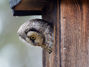 Besides their exceptional vision, owls also have extremely keen hearing. Their ear openings are directed forward and are much larger than those of other birds. The ears themselves are not visible because they are covered by feathers. The head tufts sported by some owls—the Great Horned Owl and Eastern and Western Screech-Owls, for example—are actually feathers that have nothing to do with the auditory process. Owls have asymmetrical ears—one with the central fold of the external ear directed downward, the other upward. This enables owls to locate most sounds with remarkable accuracy.